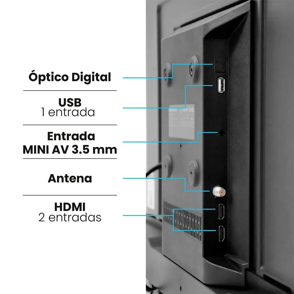 Cuenta con 2 entradas HDMI, una entrada USB compatible con grabación TDT, y salidas ópticas y de audífonos. A pesar de no ser Smart TV, funciona muy bien como monitor externo vía HDMI o como una segunda pantalla funcional para espacios reducidos. Su diseño delgado, bajo peso (~3.5 kg), soporte de pared incluido y bajo consumo (~55 W) lo convierten en una opción eficiente y práctica.