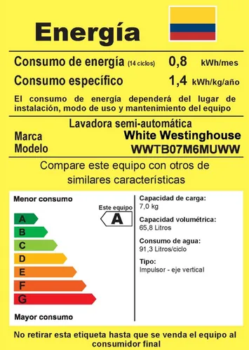 Descripción larga: Lavadora White-Westinghouse WWTB07M6MUWW: semiautomática con doble tambor (lavado y centrifugado separados), 7 kg de capacidad, temporizador manual, tambor plástico, eficiencia Clase A, voltaje 120 V, ideal para hogares con uso básico y necesidades simples de lavado.