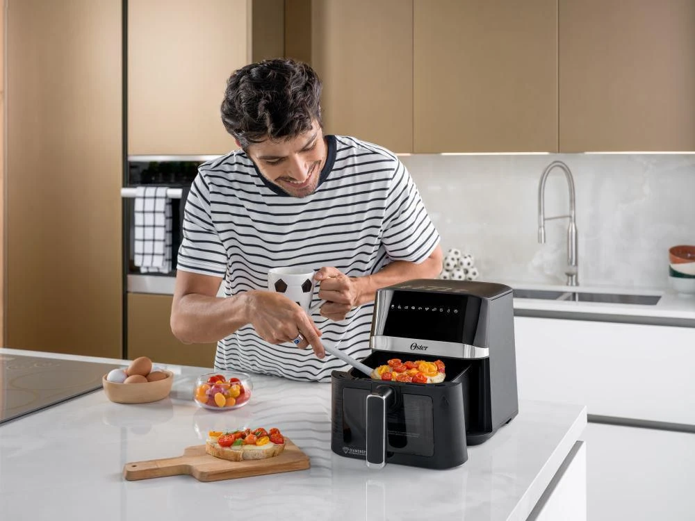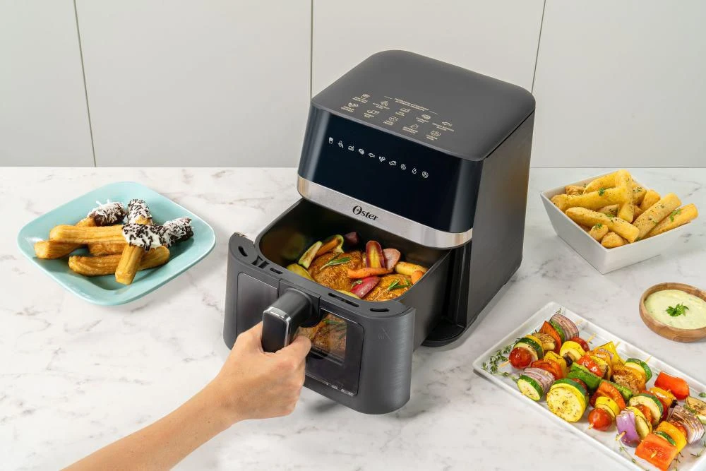 La Freidora de aire Digital Oster de 4 litros es una solución versátil y saludable para preparar tus comidas favoritas con poco o nada de aceite, ideal para familias pequeñas y medianas. Equipada con un panel digital intuitivo, esta freidora permite seleccionar entre múltiples programas automáticos predefinidos —incluyendo opciones para papas, carnes, aves, vegetales, pescado, postres y más—, facilitando la cocción con un solo toque. Su canasta extraíble con recubrimiento antiadherente DiamondForce o Bioceramic™ asegura una limpieza más rápida y duradera, mientras que el visor con luz interna te permite supervisar el proceso sin abrir la tapa.