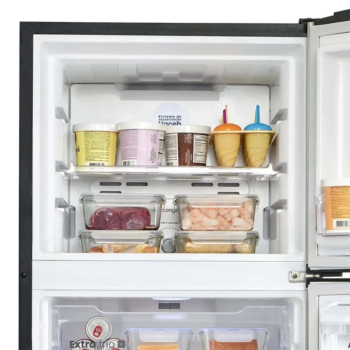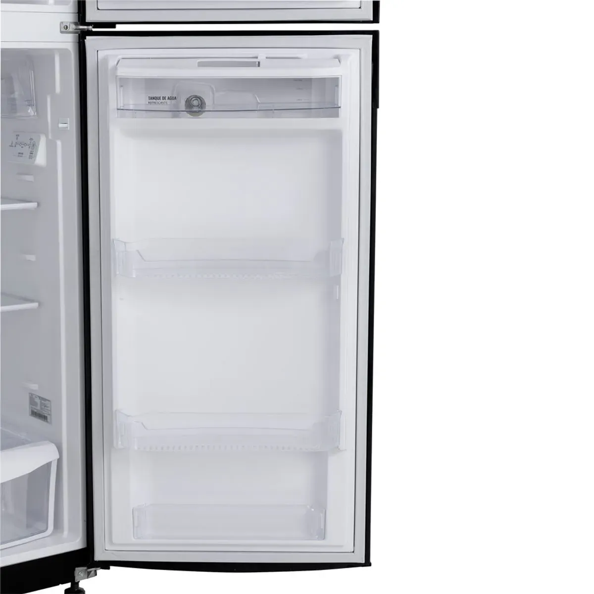 Cuenta con congelador superior, dos puertas, dispensador de agua manual y un elegante acabado en color negro que se adapta fácilmente a cualquier cocina. Su sistema Inverter optimiza el consumo energético, reduce el ruido y prolonga la vida útil del equipo.