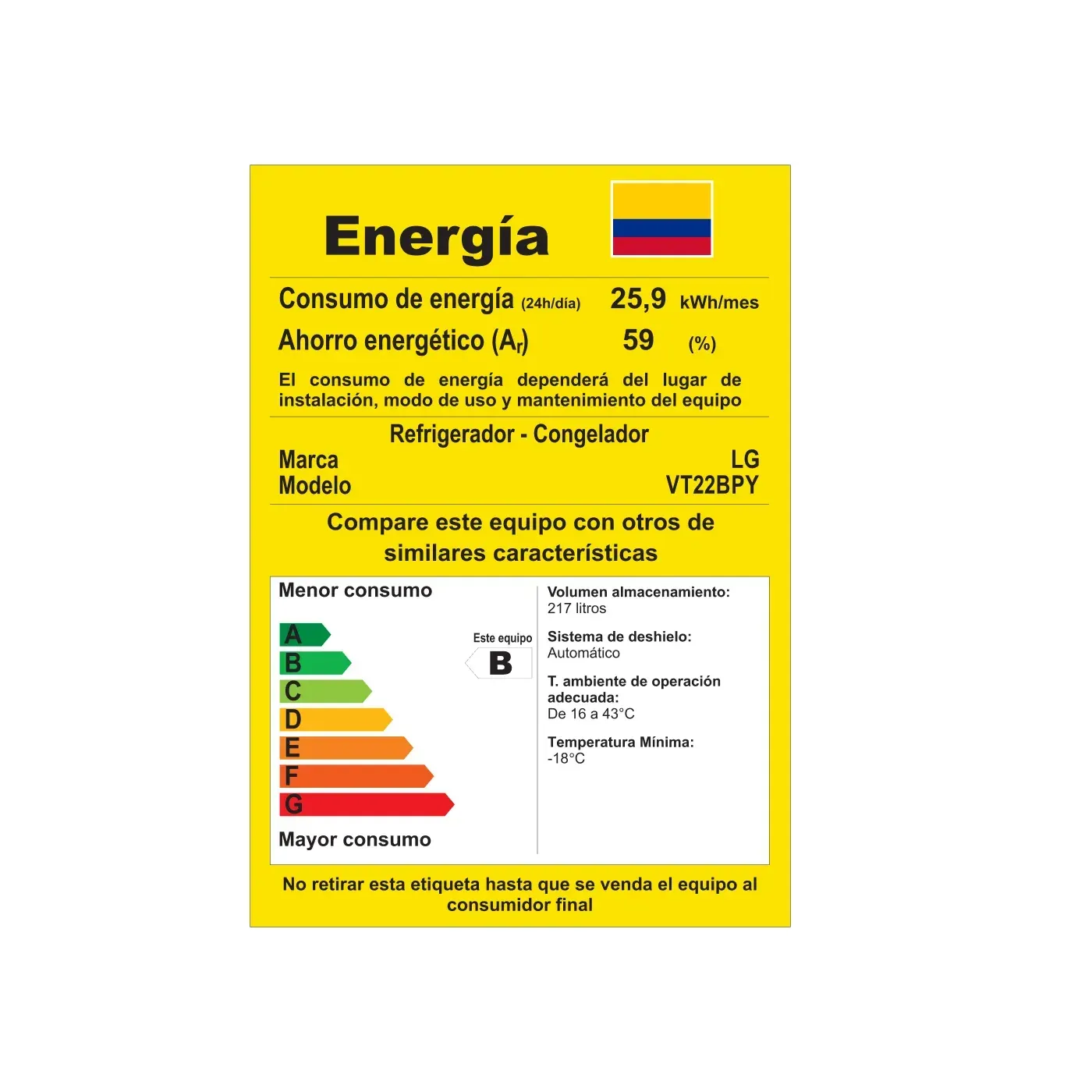 La Nevera LG VT24BPY.APYCCLM de 243 litros es una opción práctica y eficiente para quienes buscan confiabilidad y buen aprovechamiento del espacio. Su congelador superior permite una organización cómoda de los alimentos, mientras que la tecnología No Frost evita la acumulación de escarcha y mantiene una refrigeración uniforme.
