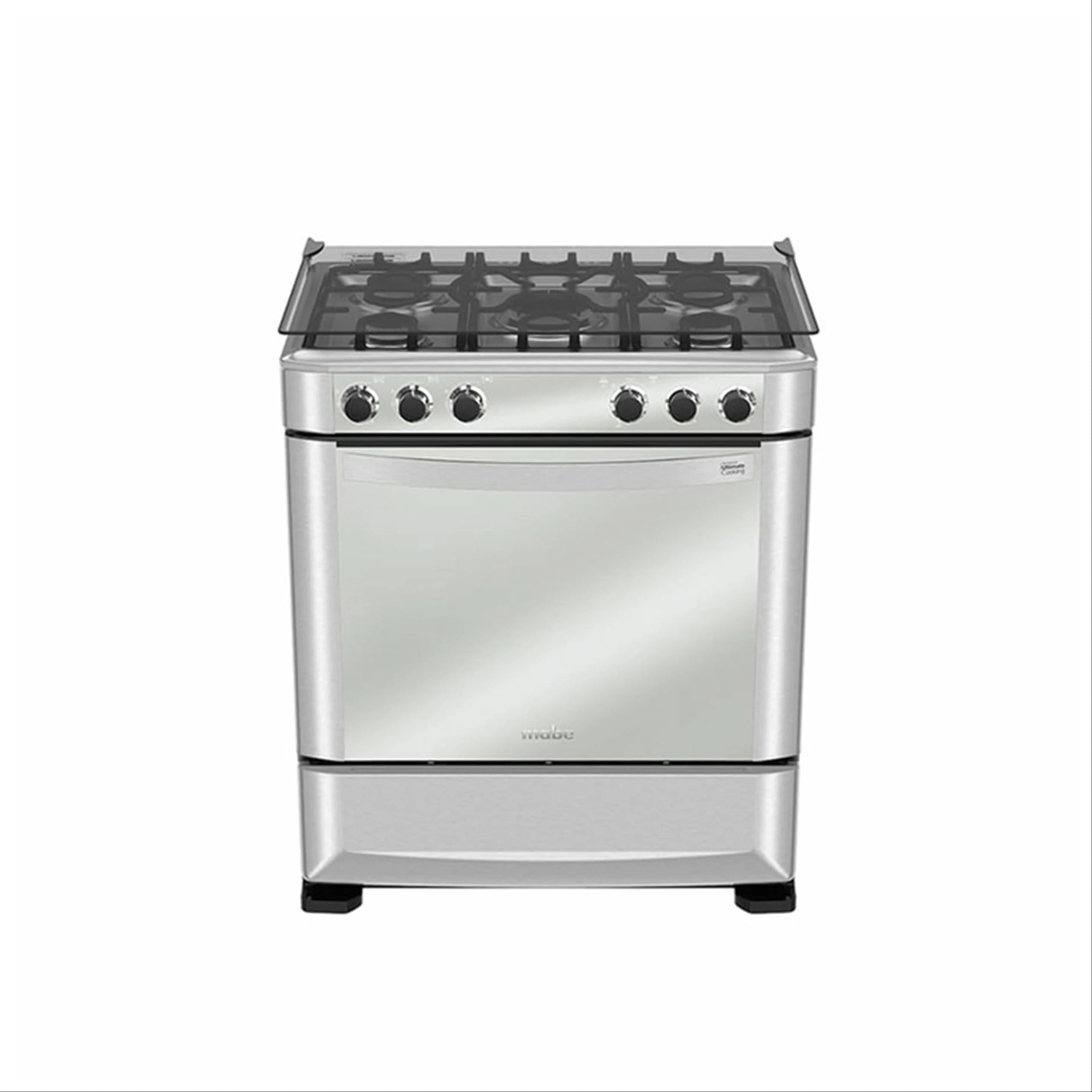 Estufa Mabe a gas natural de 6 quemadores con horno, cubierta en acero inoxidable y parrillas de hierro fundido, ideal para cocinas modernas y de alto desempeño.
