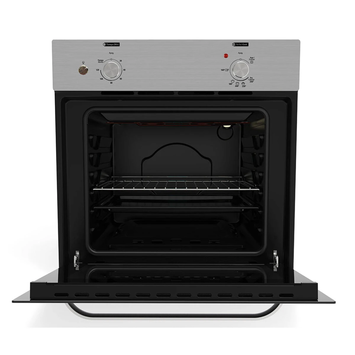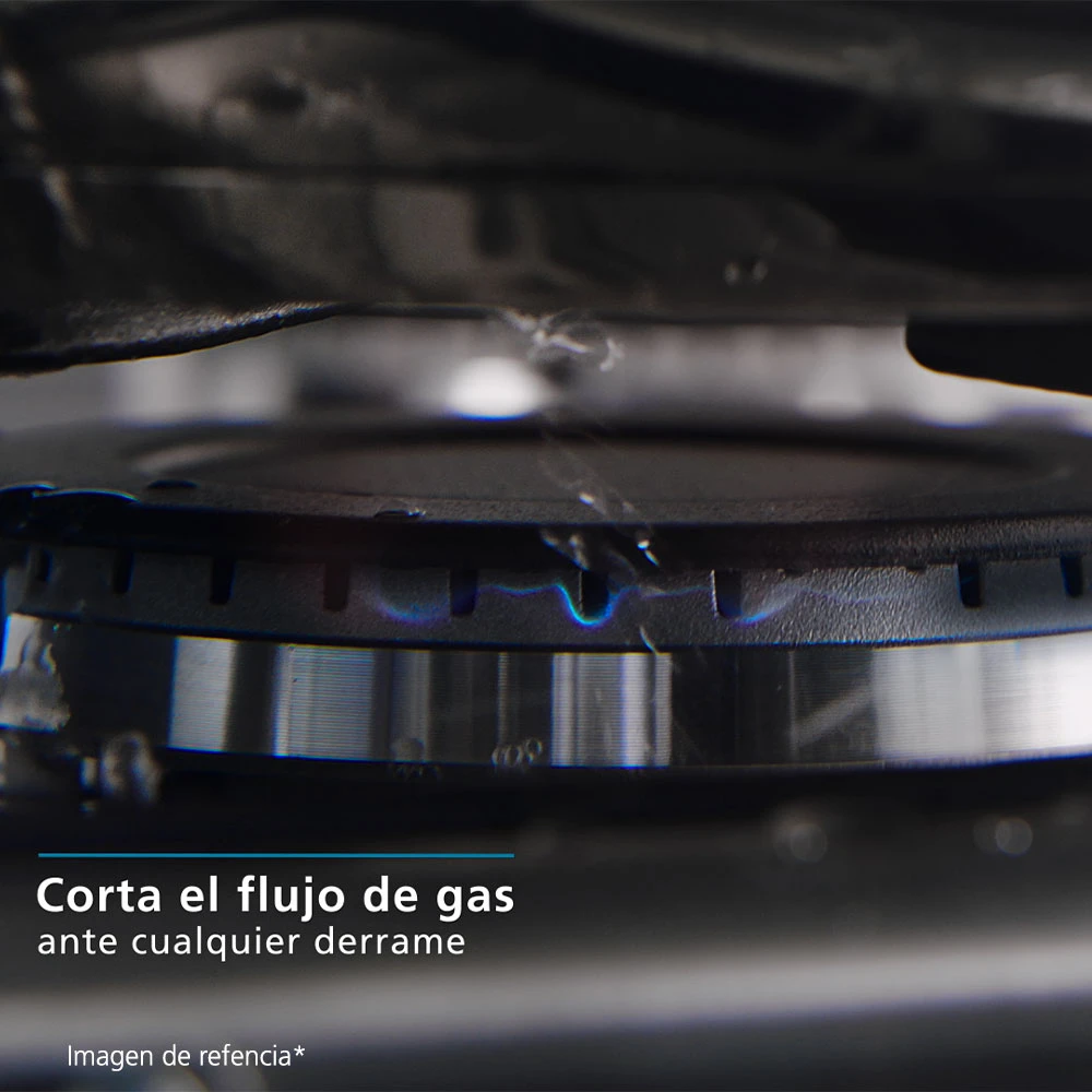 La seguridad está cubierta con encendido electrónico, termostato con sensor de flama y apagado automático en caso de corte de gas. Incluye temporizador, guía de cocción en la puerta, luz interna y ajustes de temperatura/funciones (asar, precalentar, etc).