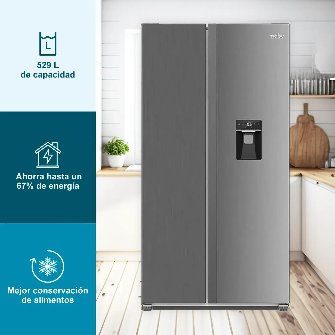Nevecón Mabe MSL521QMLSS0 de 565 L brutto (≈529 L útiles), acabado en acero inoxidable con compresor TecInverter (10 años de garantía), sistema No‑Frost, eficiencia A y consumo optimizado. Destaca por su panel táctil, dispensador de agua, circulación de aire total, estantes de vidrio templado y diseño moderno, ideal para familias y espacios amplios.