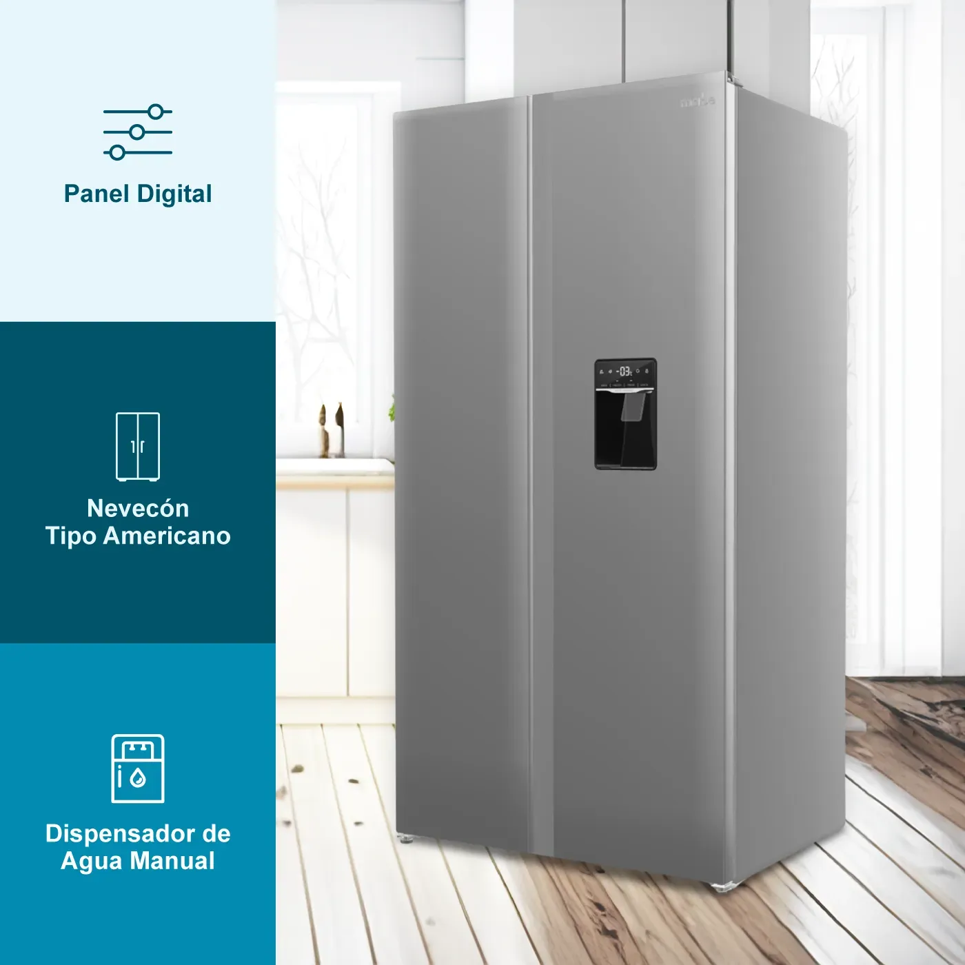 Para uso diario, cuenta con un dispensador manual de agua con cubeta removible de 3 L, bandejas de vidrio templado, iluminación LED, y cajones especiales para frutas y verduras que facilitan la organización y la conservación de alimentos