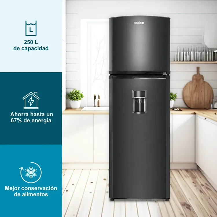 Nuestra nevera MABE RMA267PYCC con tecnología Home Energy Saver ahorra hasta un 67% de energía, gracias al compresor Eco Advance y gas refrigerante R600, cuidamos tu bolsillo con componentes de alta eficiencia que maximizan el ahorro de energía. Te da más frescura con el sistema Total Fresh Flow, que mejora la distribución del aire y así tus alimentos se conservan por mucho más tiempo.
