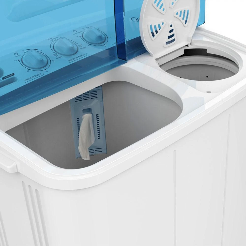 La Midea Lavadora Semiautomática MTD01W70/W-CO de 7 kg Twin Force es una solución práctica y eficiente para el lavado de ropa en hogares, apartamentos o lugares sin acceso a desagüe automático. Con dos cubetas independientes, una para lavado y otra para centrifugado, permite un proceso de lavado controlado paso a paso. Su sistema Twin Force combina movimientos del tambor para remover suciedad eficazmente, y los controles mecánicos simples facilitan el ajuste de tiempo sin complicaciones.