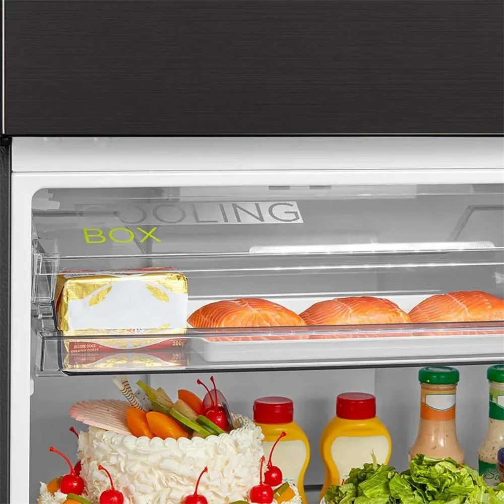 Diseñada para comodidad, incluye panel digital, parrillas de vidrio templado “Xtreme Trust”, luz LED, filtro Active C‑Fresh de carbón activado, compartimiento Cooling Box para carne/pescado y Mega Ice Box para hielos grandes. Todo esto dentro de un elegante color negro y sin escarcha.